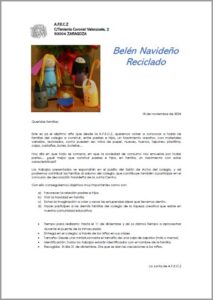 Este es ya el séptimo año que desde la A.F.E.C.Z, queremos volver a convocar a todas las familias del colegio a construir, entre padres e hijos, un Nacimiento creativo, con materiales variados, reciclados, como pueden ser: rollos de papel, nueces, huevos, tapones, plastilina, cajas, castañas, botes, botellas…