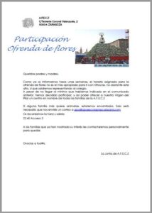 Como ya os informamos hace unas semanas, el horario asignado para la ofrenda de flores no es el más apropiado para ir con niños/as, no obstante este año, sí que saldremos representando al colegio.